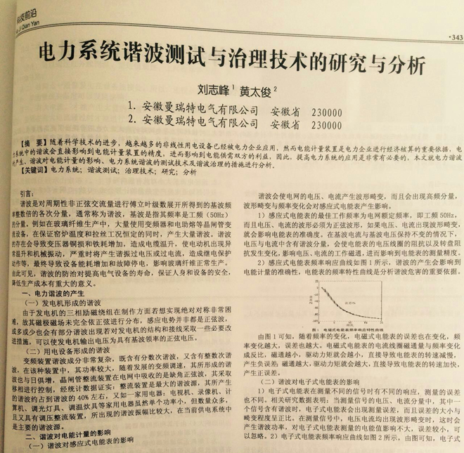 2015年5月,我公司技術中心劉志峰和黃太俊工程師的一篇關于諧波治理的論文在國家級學術期刊《信息周刊》上發(fā)表 ,該文章闡述了電力系統(tǒng)中諧波的產(chǎn)生原因以及目前國內(nèi)外主流的監(jiān)測技術并給出了合理的治理方案,對行業(yè)的交流及產(chǎn)品提升有著重要的意義。